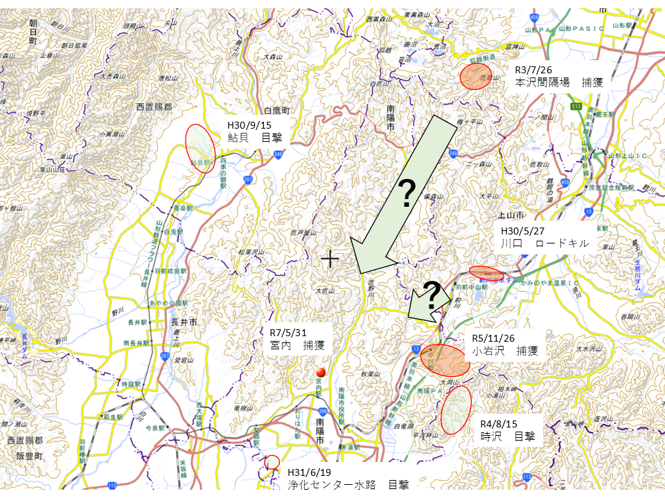 今回南陽市の中央部の丘陵地域で捕獲されたので市内の吉野、金山、宮内、漆山、梨郷の山には、ほぼほぼニホンジカがいると思われます。中川方面から侵入してきたのか、吉野方面からのどの経路で市内に入ってきたんでしょうかね(汗。市内に侵入している現状なので今後は定着阻止のためにどれだけの個体数がいるかを知ることや、どうやって捕獲することが焦点になるのかな。ニホンジカ情報については引き続きアンテナを張って収集して、報告していきます。