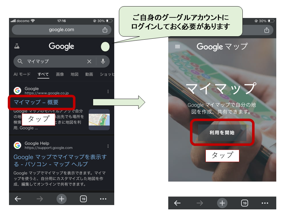 下記のように「マイマップ」と検索し、マイマップー概要のページにアクセスし、利用を開始をタップします。これで、Chromeからマイマップで作成された地図にアクセスするとgoogleマップで表示されるはずです。