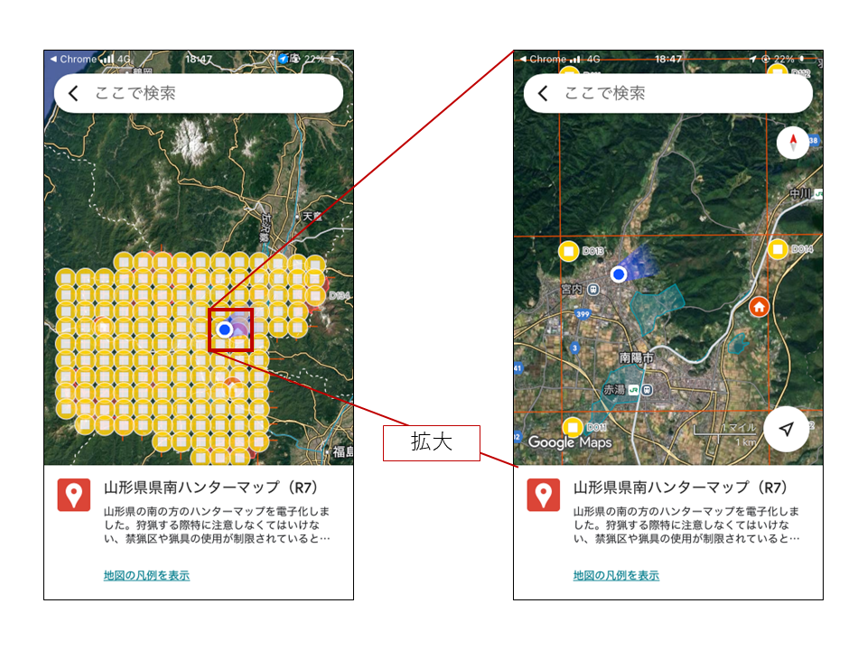 下図左のようにグーグルマップ上で表示されたら、指2本使って広げるようにピンチアウトすると拡大表示されます。青い〇が現在地の表示になってますので、地図と現在地を見比べながら、禁猟区や特定猟具使用禁止区域やメッシュ番号を確認してください。
