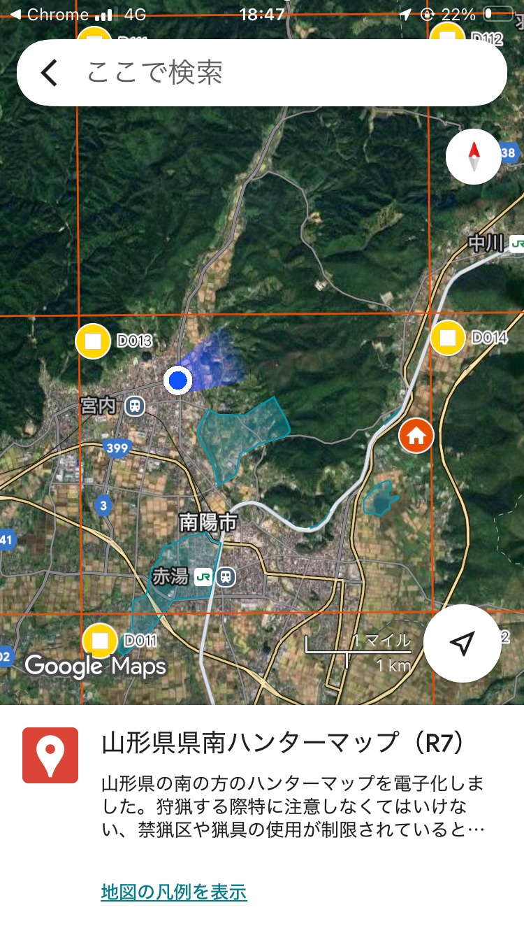 さて、前述の記事に対してスマホでのグーグルマップとの併用に関するコメント・質問していただきました。当方はスマホでハンターマップの禁猟区等を現在地と合わせて見れるように使っていますのでそのやり方を紹介します。