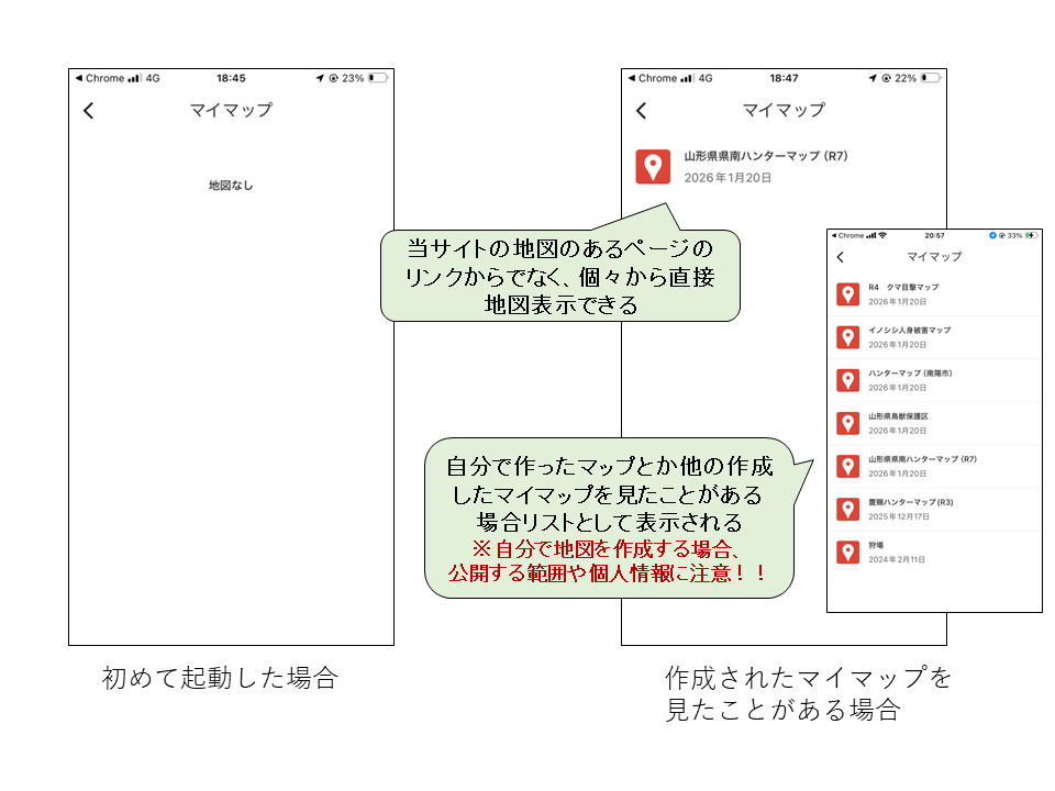 当方の作成したハンターマップ(マイマップ)にアクセスしたことがある場合やほかの方が作成された地図、自分がマイマップで作成したことがある場合右のように、複数の項目が表示されます。それぞれの項目をタップすることで、作成された地図が表示されます。