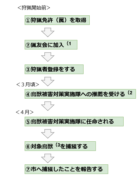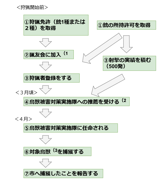 ※(2鳥獣被害対策実施隊の隊員になるには任命を受ける年度(4月はじまり3月締め)の前年度に狩猟者登録を受けている必要があります。また、猟友会からの推薦(3月ごろ)を受ける必要があります。(明文化されていませんが、猟友会に加入は必須と思われます。)