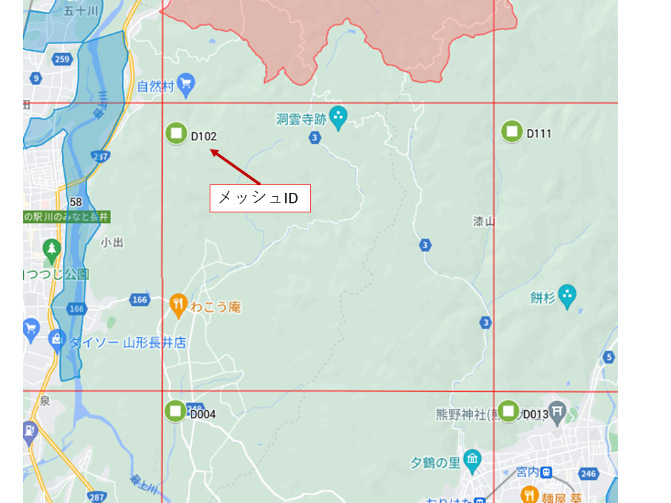 ※置賜地区外のメッシュについてはきちんと格子を作っていません。そのメッシュで狩猟する方はお手持ちのハンターマップ等でメッシュIDやメッシュの境を確認ください。
