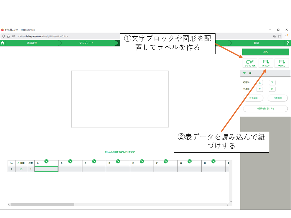 白紙のフォーマットを選ぶと下記のような白紙のラベルと何も入ってない表が表示されます。ここで前述で説明したようにデザイン編集を行ってラベル構成を作り、差し込みを行う表を読み込んで紐づけを行います。