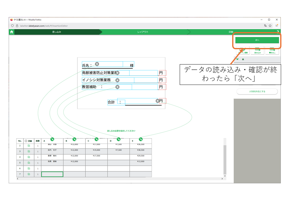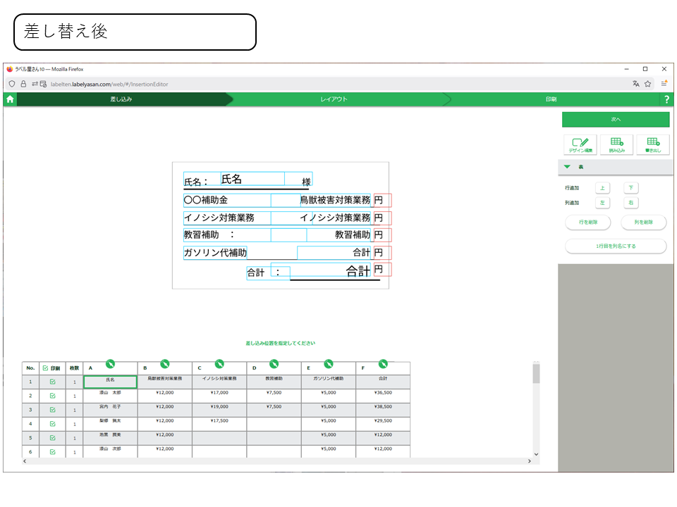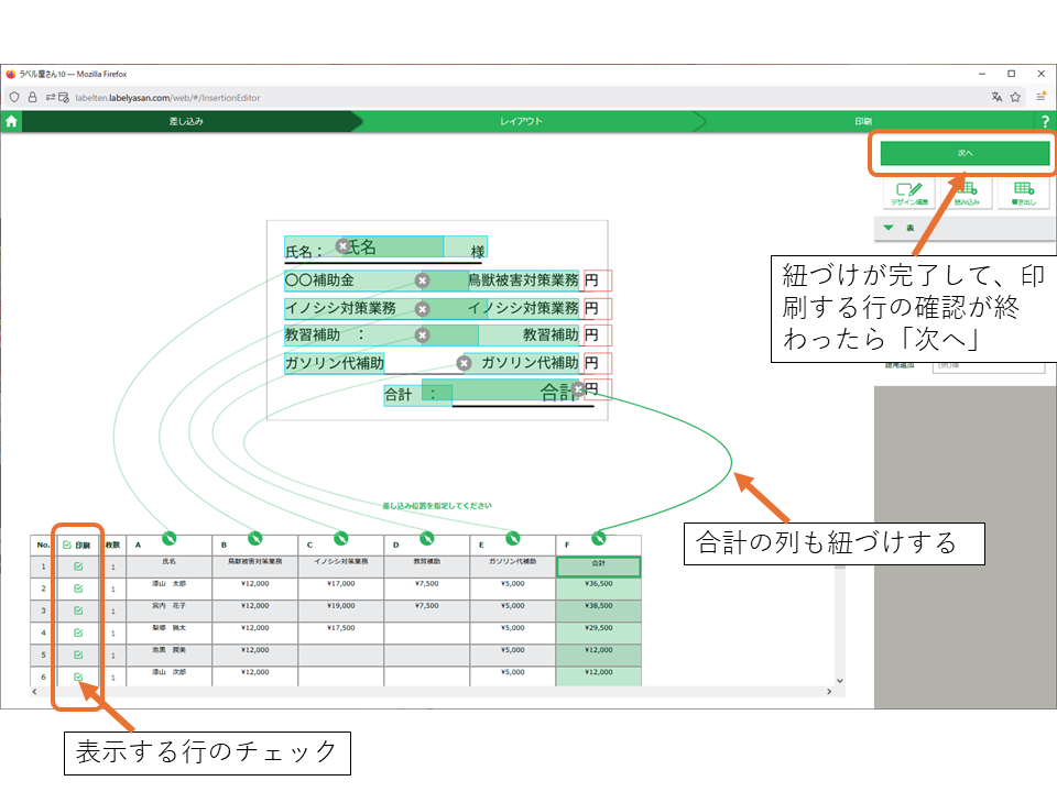 ラベルの文字ブロックと表の列の紐づけが完了して、印刷する行をチェックし終わったら次へを押します。