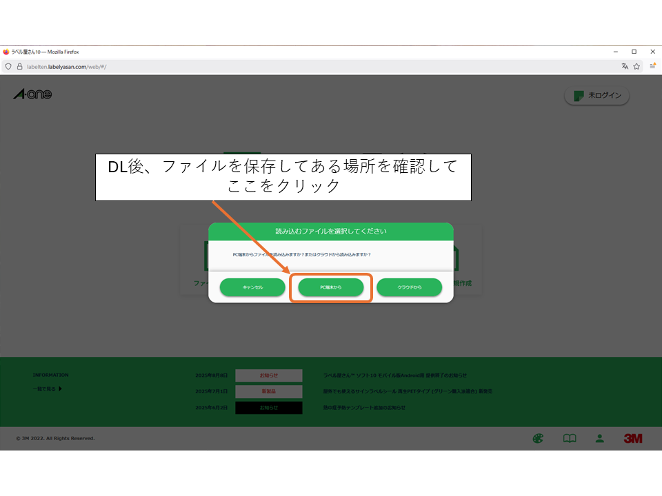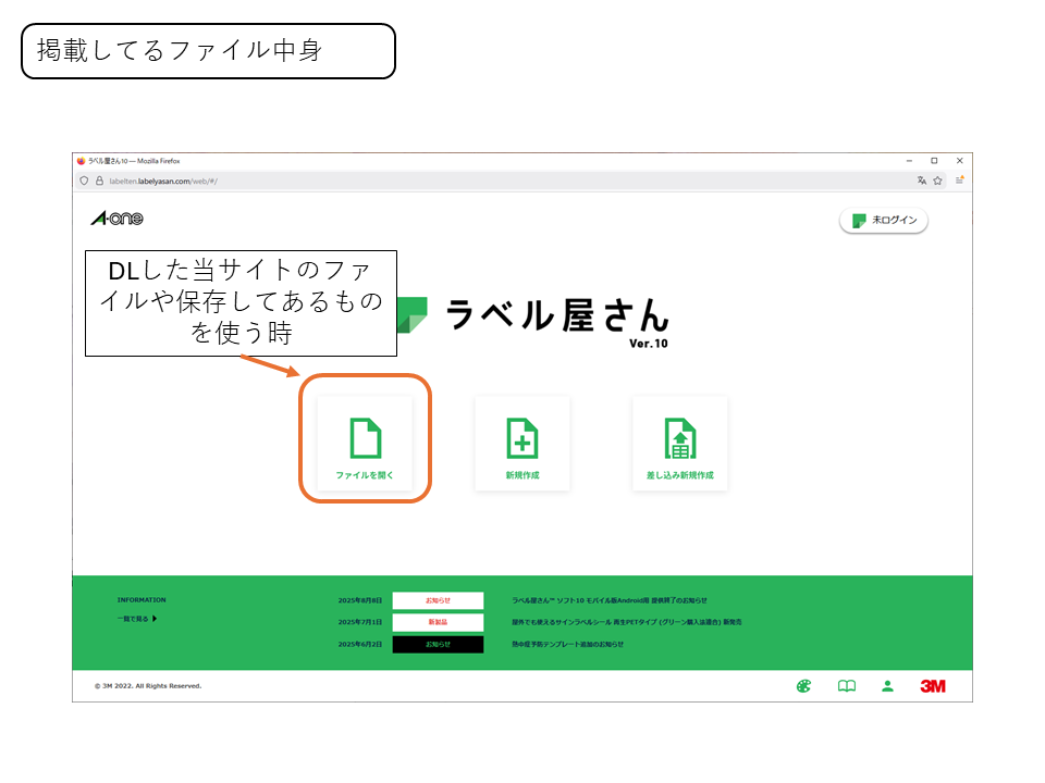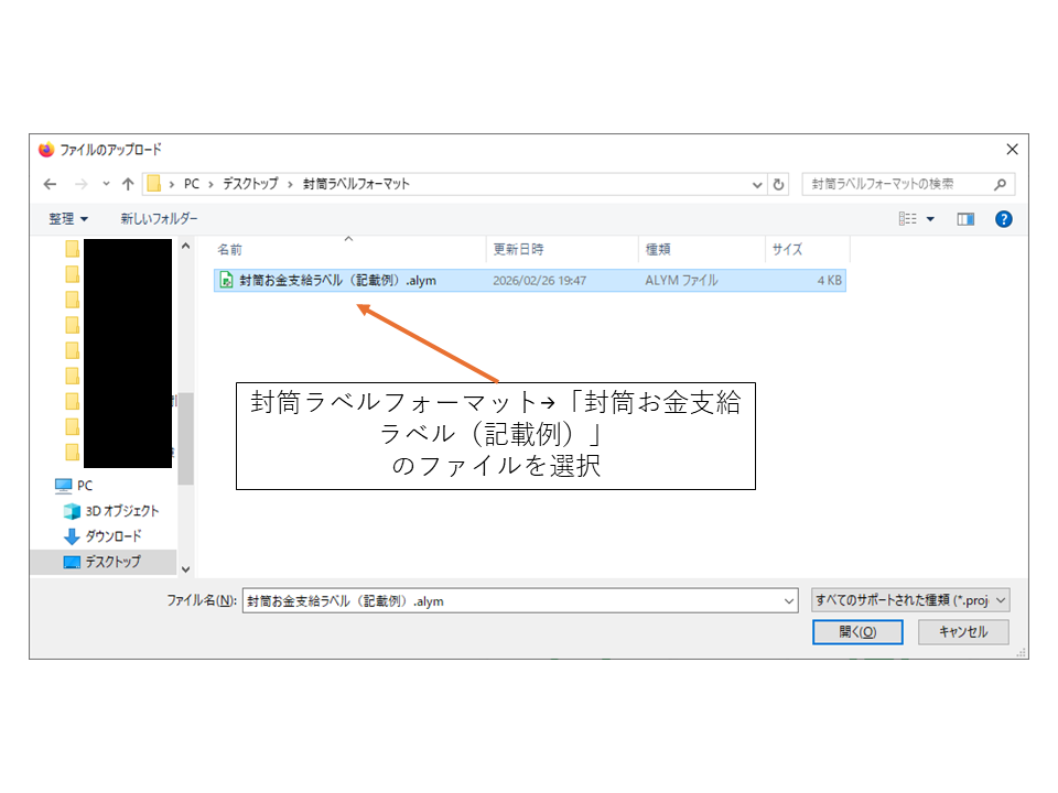 ラベル屋さんのブラウザ版を起動して、解凍したフォルダ中の「封筒お金支給ラベル(記載例).alym」を下記の図に従って読み込みます。拡張子の表示をしていない人は「封筒お金支給ラベル(記載例)」のファイルを開いてください。