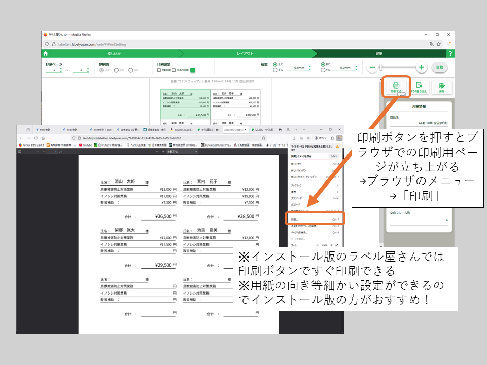 インストール版だと、印刷プリンタの選択などを行ってすぐ印刷できます。用紙の向き等細かい設定ができるのでインストール版の方がおすすめです。