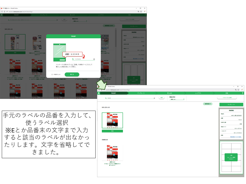 テンプレートを選択する前に、使用するお手持ちのラベルの品番を入力して、使用するラベルを選びます。アマゾン版だけなのかもしれませんが品番(数字)+Eとなっていて全部入力すると出ない場合がありましたが、その場合数字部分だけ入力すれば問題なく使用できました。Eはeconomy?の略ですかね?ご参考までに。