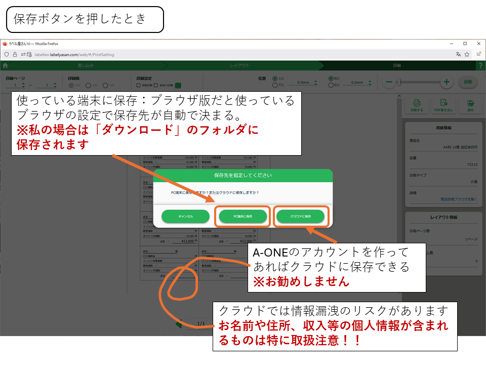 A-ONEのアカウントを作ってあればクラウドでの保存もできます。が、クラウドでは情報漏洩のリスクがあります。(ローカル環境でもセキュリティ設定が甘いと漏洩しますが汗)なので、個人情報を含む場合はご自身の端末上への保存をお勧めします。