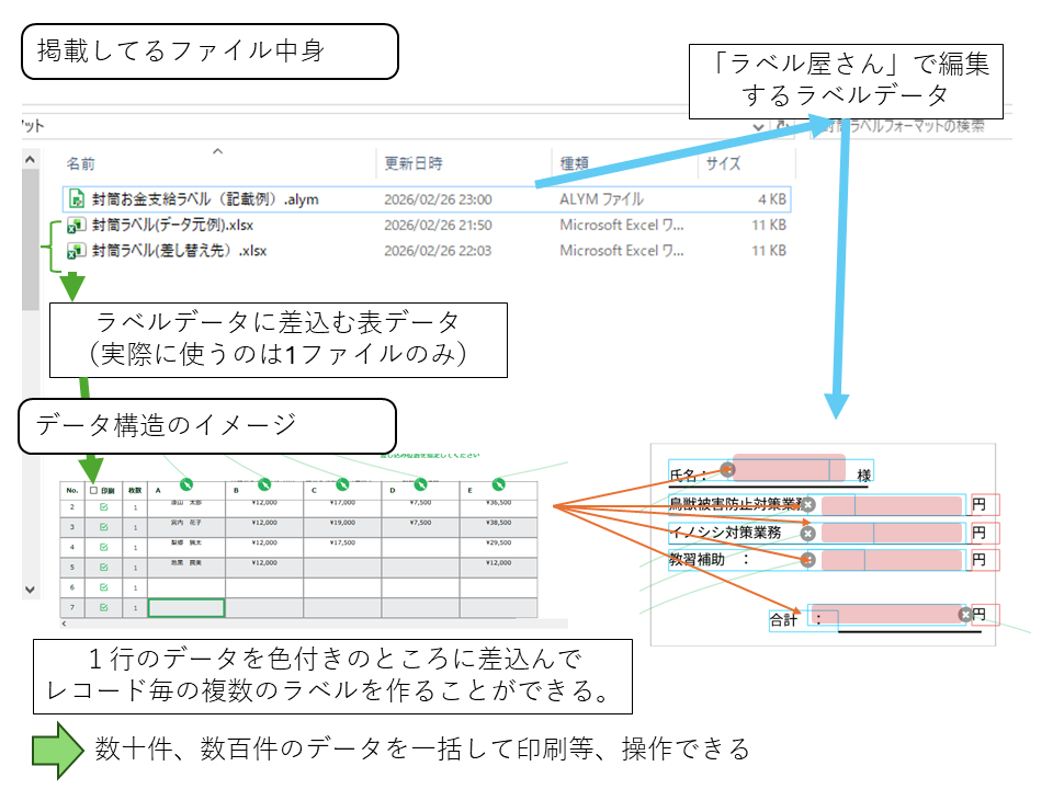 サンプルデータの中身は下記のようになっています。ラベル屋さんのラベルデータの入った1ファイルとラベルデータに読み込まれるexcelファイル2個となっています。それらのデータの関係は下記の図のようになってます。