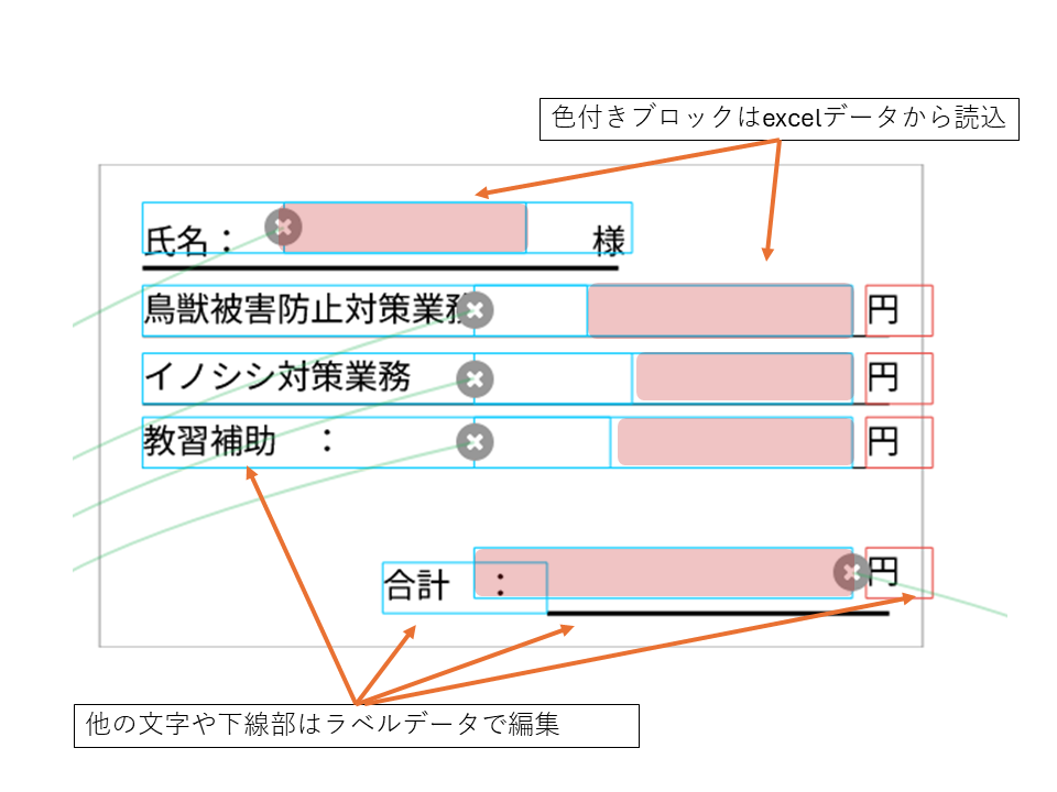 ラベルデータ構成の説明です。余計な緑線がついていますが、ラベルデータは下記のように文字ブロックと図形ブロックで構成されており、印字する文字ブロック(青枠・赤枠)と差込データとリンクした文字ブロック(赤色付)でできてます。