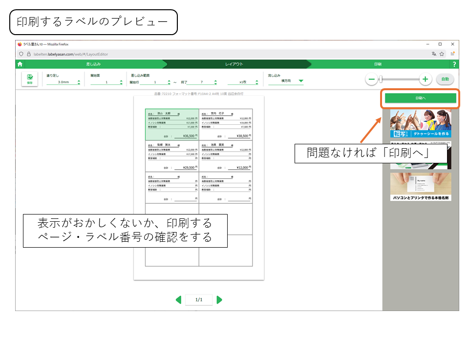 印字するラベルのプレビューが表示されます。ここで問題がなければ次へをしてください。
