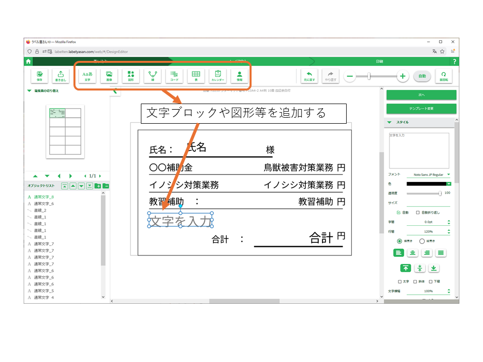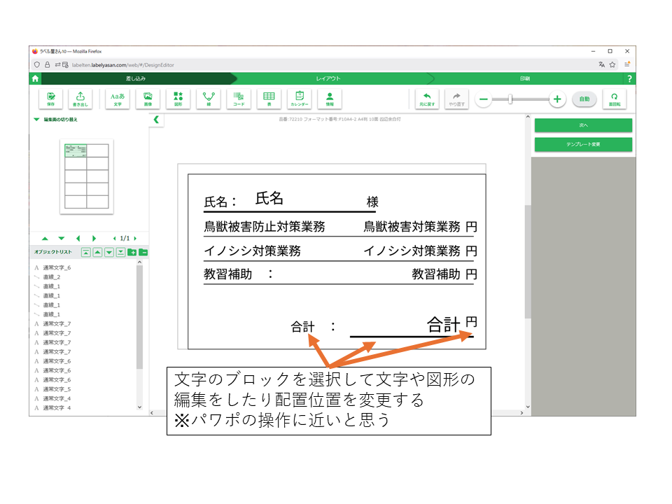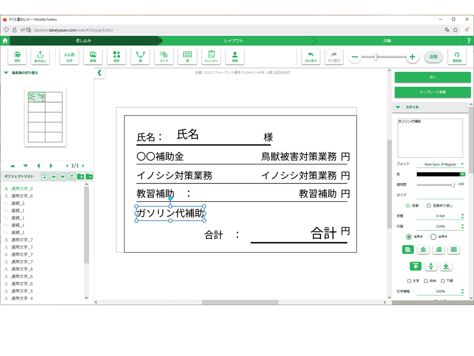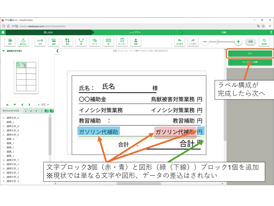印字するガソリン代と円と下線、各人によって変わる金額の項目を文字ブロック・図形ブロックとして追加します。ラベル構成が完成したら次へを押します。