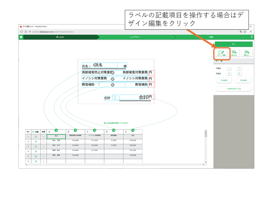ラベルの記載項目を変更する場合はデザイン編集をクリック