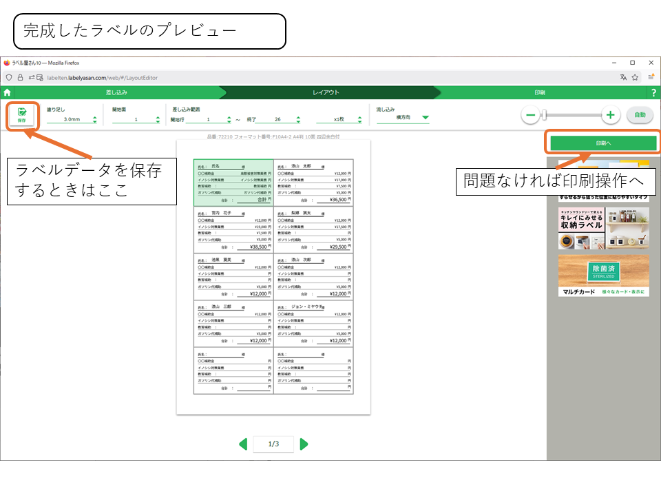 プレビューが問題なけれ次へを押して印刷操作へ行きます。保存するときは上のメニューボタンの保存を押します。