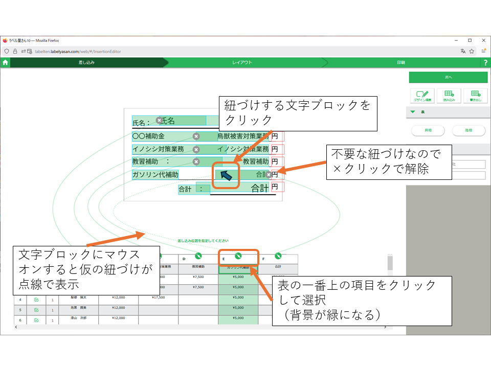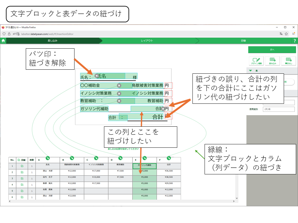 下の表部分を選択するとラベルの項目と紐づけの表示がされます。緑の実線は表の列と紐づけしてある文字ブロックを島しています。ラベルについているバツ印は紐づけを解除できます。今の段階だと、追加したガソリン代の金額項目と表のガソリン代の列を紐づけします。更新した都合で前の表の合計がガソリン代の値のところについているのでこれは解除して、一番下の合計金額の金額のところに紐づけなおします。